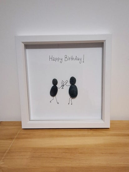 A gorgeous handcrafted picture of friends celebrating in a box frame (20 x 20cm) with glass ready to hang, created using local pebbles and wood.