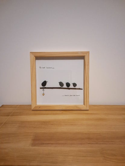 A gorgeous handcrafted picture of a teacher and students in a box frame (20cm x 20cm) with glass ready to hang, created using local pebbles and wood.