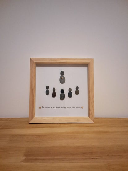 A gorgeous handcrafted picture of a family in a box frame (20cm x 20cm) with glass ready to hang, created using local pebbles and wood.