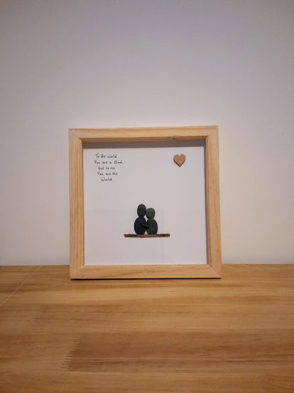 A gorgeous handcrafted picture of a dad and child in a box frame (20cm x 20cm) with glass ready to hang, created using local pebbles and wood.
