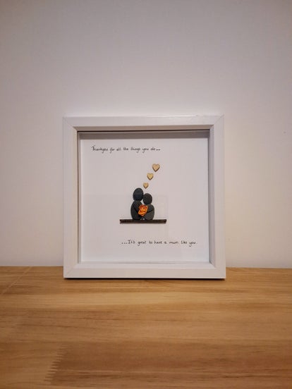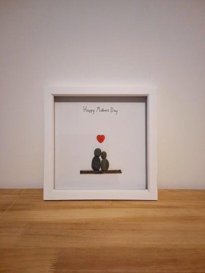 A gorgeous handcrafted picture of a mum and daughter/son in a box frame (20cm x 20cm) with glass ready to hang, created using local pebbles and wood.