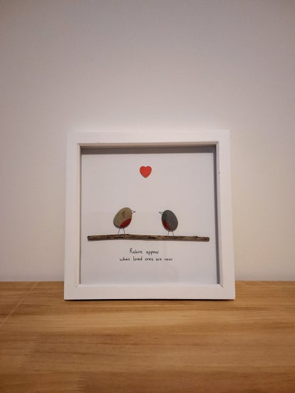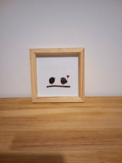 A gorgeous handcrafted picture of 2 robins in a box frame (15x15cm) with glass ready to hang, created using local pebbles and wood.