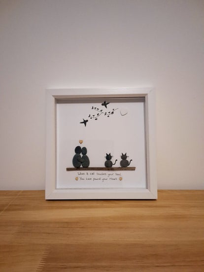 A gorgeous handcrafted picture of a cat family in a box frame (20cm x 20cm) with glass ready to hang, created using local pebbles and wood.