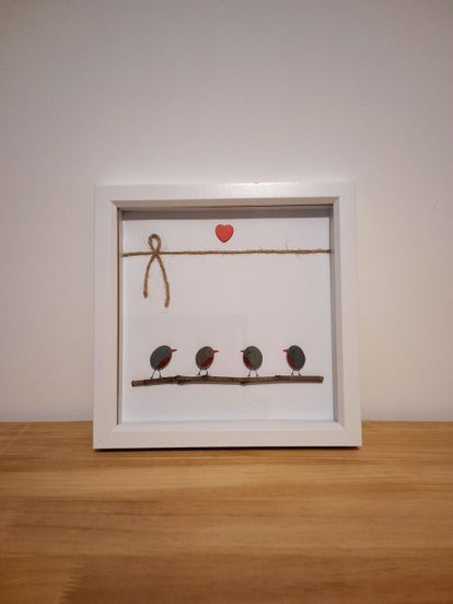 A gorgeous handcrafted picture of robins in a box frame (20cm x 20cm) with glass ready to hang, created using local pebbles and wood.