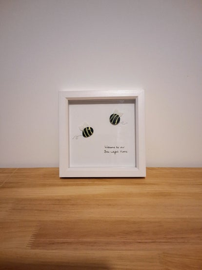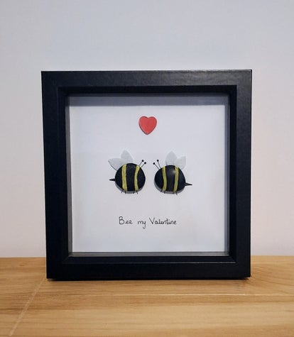 A gorgeous handcrafted picture of a bee couple in a box frame (15x15cm) with glass ready to hang, created using local pebbles and wood.