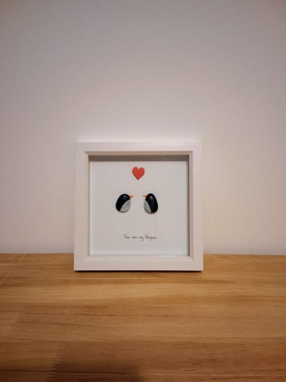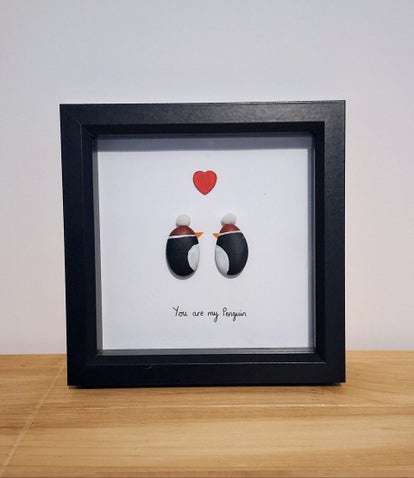 A gorgeous handcrafted picture of a penguin couple in a box frame (15cm x 15cm) with glass ready to hang, created using local pebbles and wood.