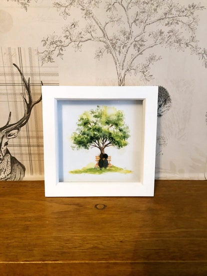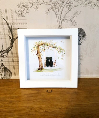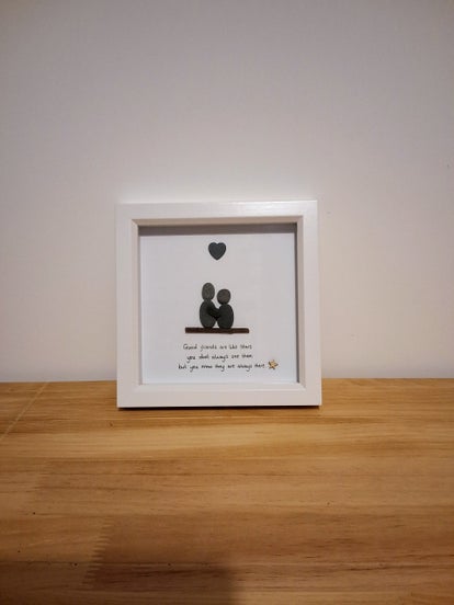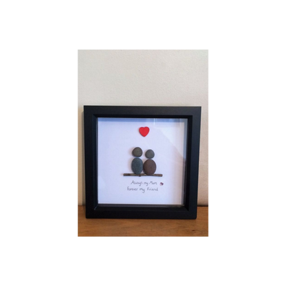 A gorgeous handcrafted picture of friends in a box frame (15x15cm) or (20x20cm)with glass ready to hang, created using local pebbles and wood.