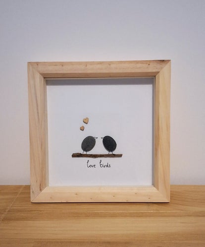 A gorgeous handcrafted picture of love birds in a box frame (15x15cm) with glass ready to hang, created using local pebbles and wood.