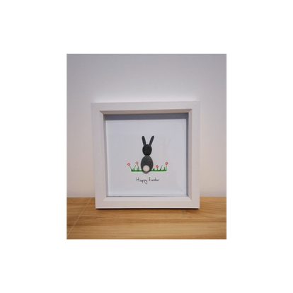 A gorgeous handcrafted picture of an easter bunny in a box frame (15x15cm) with glass ready to hang, created using local pebbles and wood.