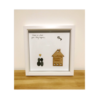 A gorgeous handcrafted picture of a new home din a box frame (20cm x 20cm) with glass ready to hang, created using local pebbles and wood.