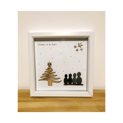 A gorgeous handcrafted picture of christmas at your house in a box frame (20cm x 20cm) with glass ready to hang, created using local pebbles and wood.