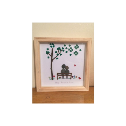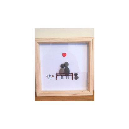 A gorgeous handcrafted picture of a couple on bench in a box frame (15x15cm) or (20cm x 20cm) with glass ready to hang, created using local pebbles and wood.