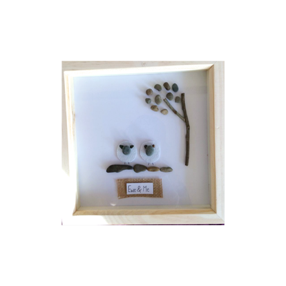 A gorgeous handcrafted picture of 2 sheep in a box frame (20cm x 20cm) with glass ready to hang, created using local pebbles and wood.