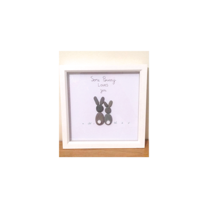A gorgeous handcrafted picture of a bunny couple in a box frame (20cm x 20cm) with glass ready to hang, created using local pebbles and wood.